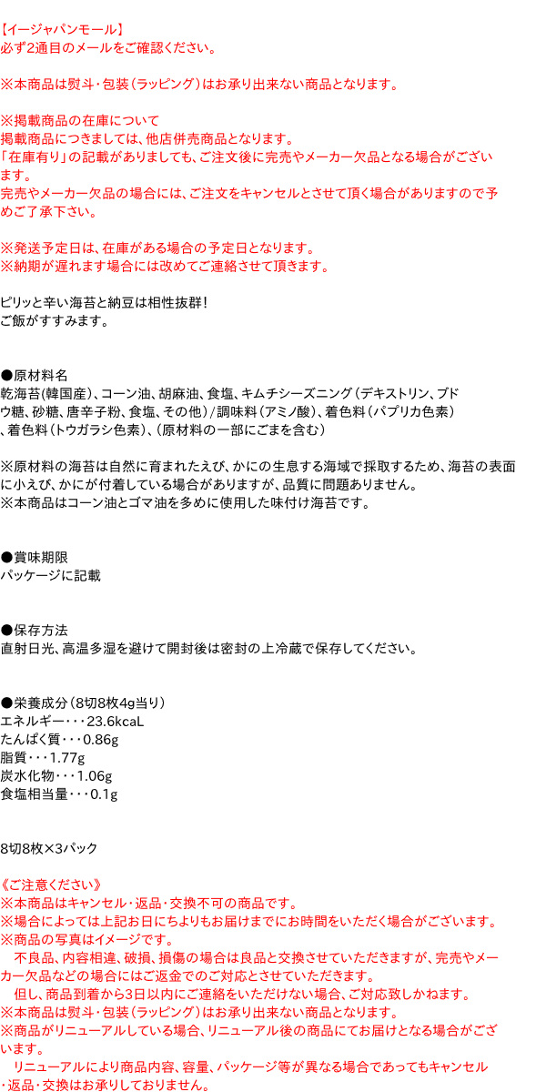 マルホ物産 韓国キムチ味付海苔8切8枚3袋 ×24個 はコチラ >>【イージャパンショッピングモール】内のみのお買い物は、送料一律でどれだけ買っても同梱する事が出来ます。