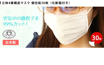 送料無料 マスク 日本製 30枚 不織布 個包装【プリーツ PM2.5 4層構造 使い捨てマスク 30枚セット 抗菌 ウイルス対策 個別包装 耳が痛くならない レディース 白 国産 1枚ずつ メガネが曇らない メガネが曇りにくい ノーズフィッター 化粧箱 ギフト プレゼント】夏ギフト